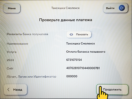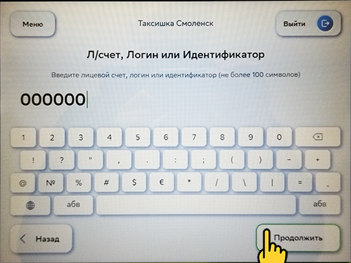 3. В поле "Л/счёт" введите Ваш личный Аккаунт (посмотреть можно в водительском приложении Баланс > Терминальные аккаунты) и нажмите кнопку "Продолжить".