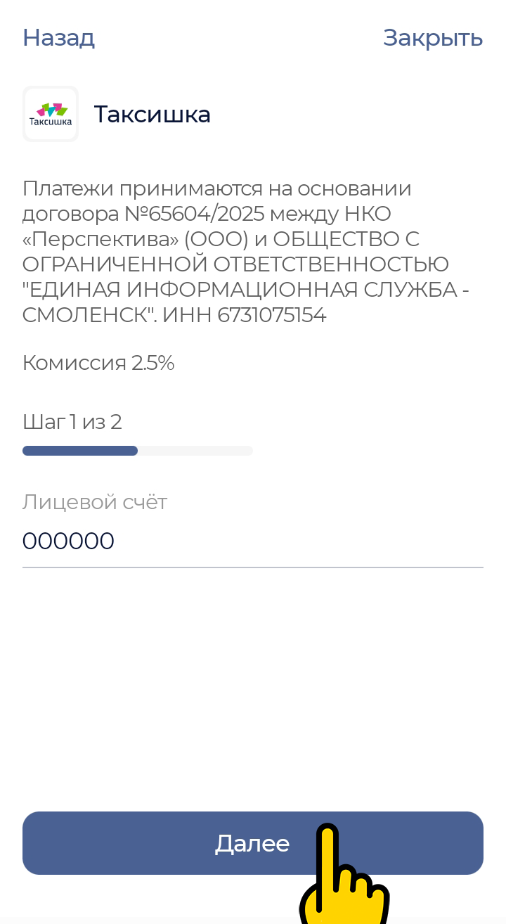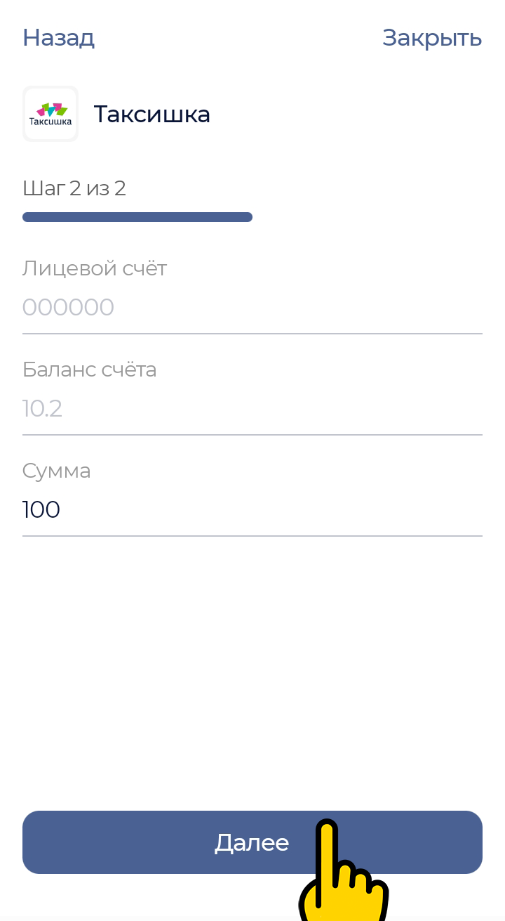 6. В следующем окне укажите ваш Аккаунт, сумму платежа, и нажмимте кнопку "Далее".