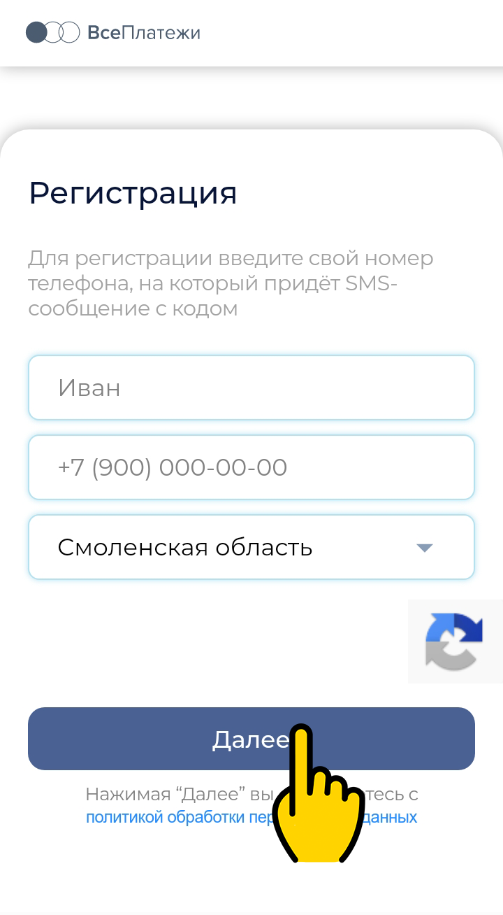 3. В следующем окне заполните ваше имя, мобильный телефон, и выбирите регион "Смоленская область".